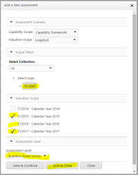 Select one or more Calendar entries in the Valuation Scope. Based on the selection, the participants will asked to enter the maturity score for each of the calendar entries selected. You may select current year to represent current state and another year in the future to represent target/desired state. You will be able to change the valuation scope i.e. pick other calendar entries at a later time.