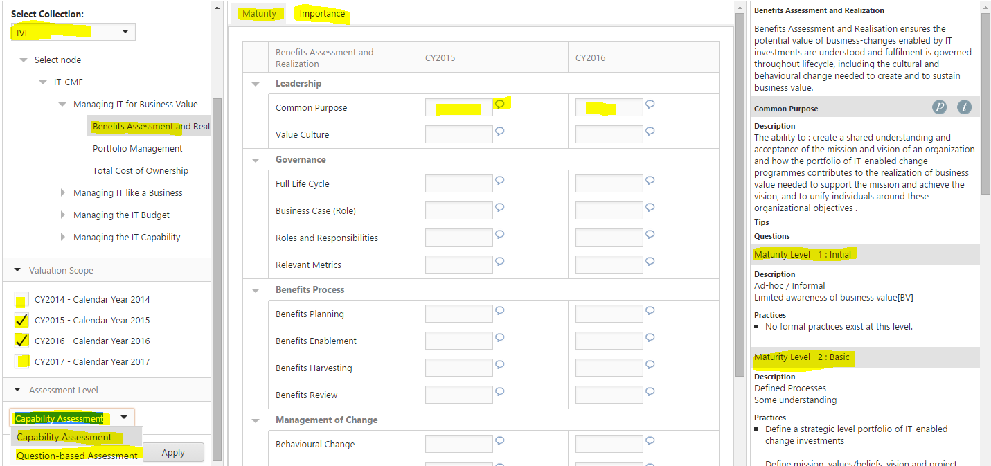 1. Select the Capability Scope. For assessing one of the IT-CMF capabilities, select IVI collection, otherwise pick another collection from the drop-down list. Navigate the IT-CMF model, and select the critical capability. Select the top node “IT-CMF” for IT-CMF level assessment, same as conducting an Executive Assessment
