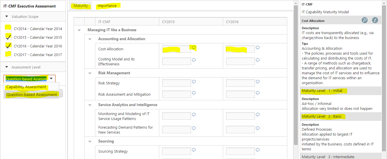 • Enter Importance Scores. Select the second tab labeled as Importance. Just like maturity scores enter any value between 1 and 5 and the comments.